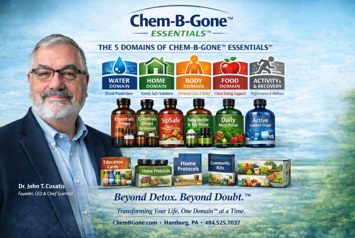 Chem‑B‑Gone Essentials™ organizes every product into a simple Five‑Domain System so families can build cleaner routines one domain at a time.